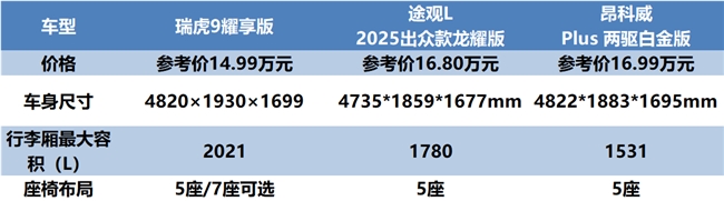 相比之下,途观L龙耀版与昂科威Plus两驱白金版在空间灵活度与储物能力上稍逊一筹。途观L龙耀版车身尺寸4735×1859×1677mm,仅提供五座布局,最大容量1780L的后备箱没有瑞虎9耀享版来得宽敞。昂科威Plus两驱白金版车身尺寸与瑞虎9耀享版大差不差,但它1883mm的车宽比瑞虎9耀享版窄,5 座满载时横向空间局促,乘坐的舒适性相对会大打折扣。而且它行李箱拓展后容积仅1531L,是三款车型中最小的。