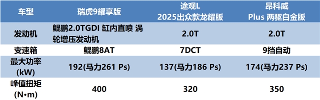 反观途观L龙耀版和昂科威Plus两驱白金版,途观L龙耀版搭载2.0T发动机+7DCT变速箱,它的动力参数相对保守,日常通勤虽能满足需求,但中后段加速动力储备不足,且底盘调校偏向舒适,复杂路况下支撑性有限。昂科威Plus两驱白金版采用2.0T发动机+9AT变速箱,最大马力237Ps,动力表现介于两者之间。但它底盘调校偏硬朗,对细碎震动的过滤不够到位,驾驶舒适性和瑞虎9耀享版就不在一个档次了。