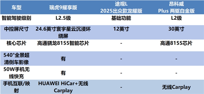 相比之下,途观L龙耀版配备12英寸中控屏,仅支持导航、娱乐等基础功能,驾驶辅助功能偏基础,缺少540°全景超清影像等实用配置。昂科威Plus虽有30英寸中控屏和高通骁龙8155芯片,但驾驶辅助系统为L2级,它们在智能生态与交互体验上与瑞虎9耀享版差距明显。
