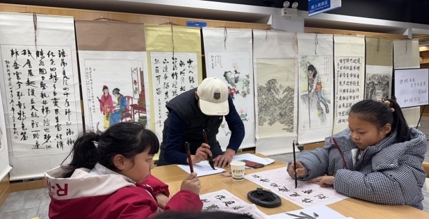 参与者围绕“传统艺术在当代的生命力”展开讨论。传统不是静止的标本,而是流动的河流。水墨艺术深厚的美学底蕴和哲学内涵,恰恰能为当代快节奏生活提供一种“慢下来”的观照方式,而其材料与表现语言的开放性,也让它能与当代人的情感与观念不断产生新的共鸣。也激发了艺术传承的当代思考与新创组的思想碰撞.在丁老师的悉心指导下,小读者们屏息凝神、挥毫泼墨,完成了一幅幅或稚趣横生、或笔力初显的书法作品。一时间,教室里墨香四溢,专注与喜悦的气息在笔尖静静流淌。